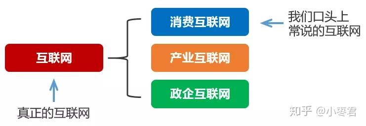 注意,我们普通用户平时接触的互联网(包括移动互联网),准确来说,只是“真正互联网”的一个分支,称之为“消费互联网”。