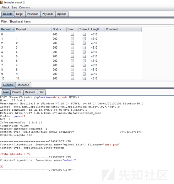 本关对文件后缀名做了白名单判断,然后会一步一步检查文件大小、文件是否存在等等,将文件上传后,对文件重新命名,同样存在条件竞争的漏洞。可以不断利用burp发送上传图片马的数据包,由于条件竞争,程序会出现来不及rename的问题,从而上传成功: